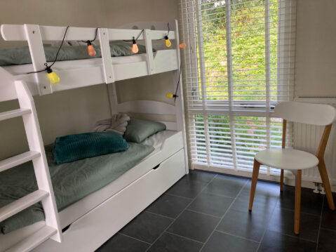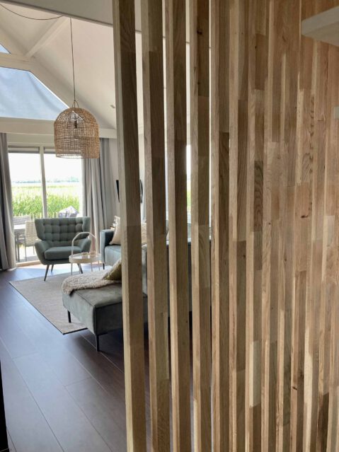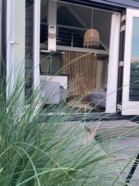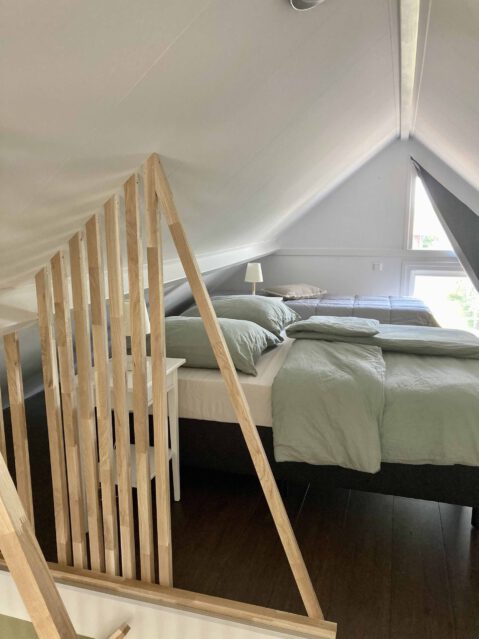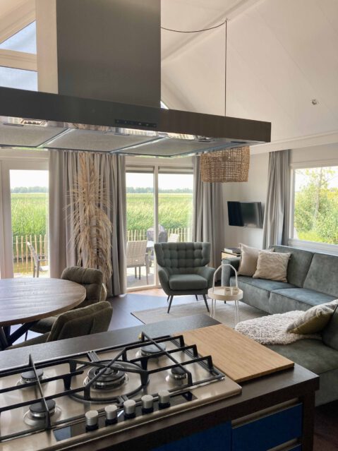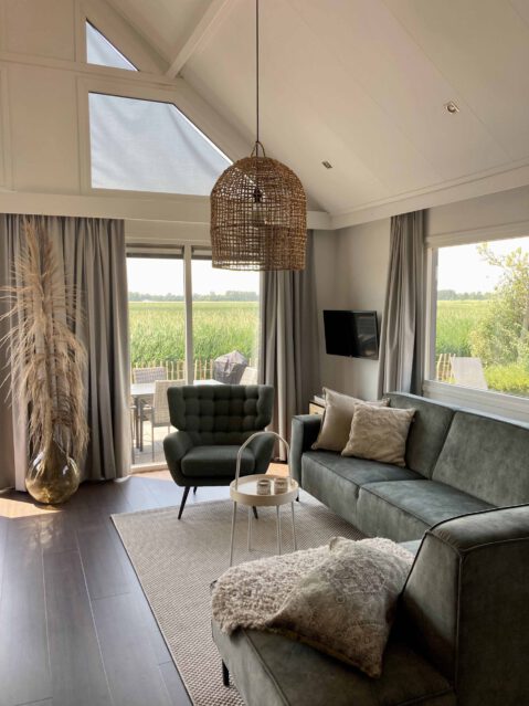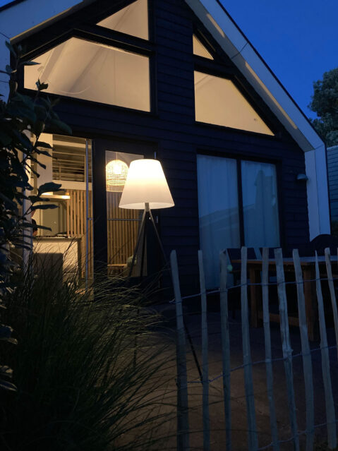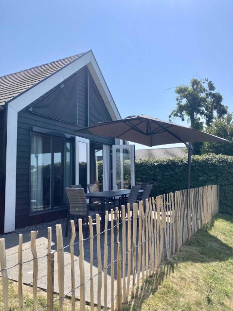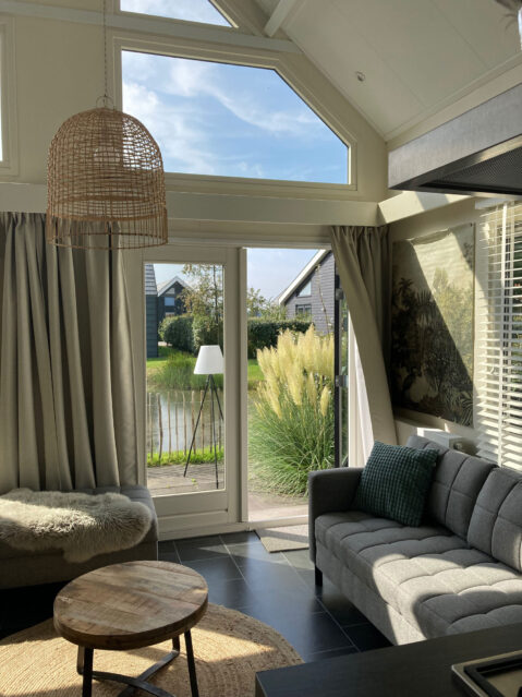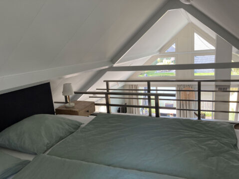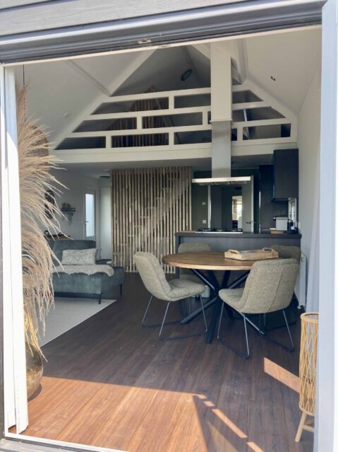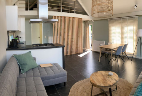 Unser Chalet Hauszeit № 6 im Herzen Zeelands hat Platz für bis zu fünf Personen und ist 65 qm groß. Auf der Galerie befindet sich ein großes Boxspring-Doppelbett, im zweiten Schlafzimmer im Erdgeschoß wartet ein Hochbett mit drei weiteren Schlafplätzen auf euch. Außerdem gibts im Erdgeschoß ein kleines aber sehr modernes Badezimmer mit Dusche. Die Küche hat einen Geschirrspüler, Kühl-Gefrierkombination sowie einen Gasherd mit Backofen. Waschmaschine, Grill, Zentralheizung und Klimaanlage gibts auc